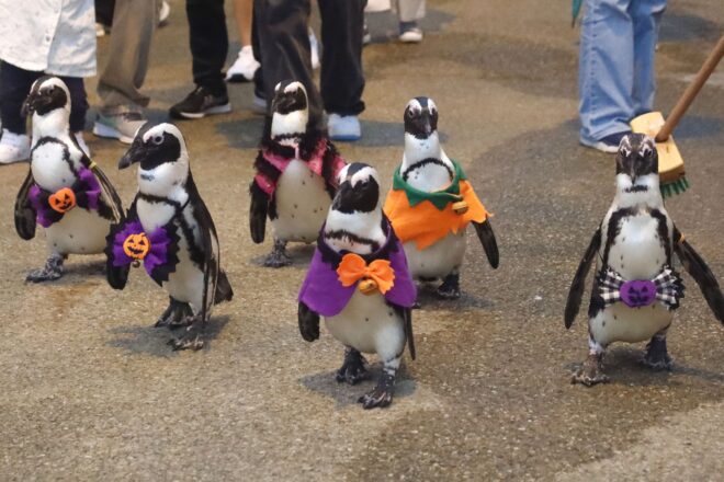 11日からペンギンたちがハロウィン衣装でお散歩しています。他の衣装は統一感のあるものが多いですが、ハロウィン衣装は色や形などバリエーションに富んでいます。お散歩している様子は、まさにハロウィンパレードといった感じです。 園内写真スポットなどにハロウィンの装飾が施されています。撮影用にちょっとした衣装も置いてありますので、ぜひご利用ください!