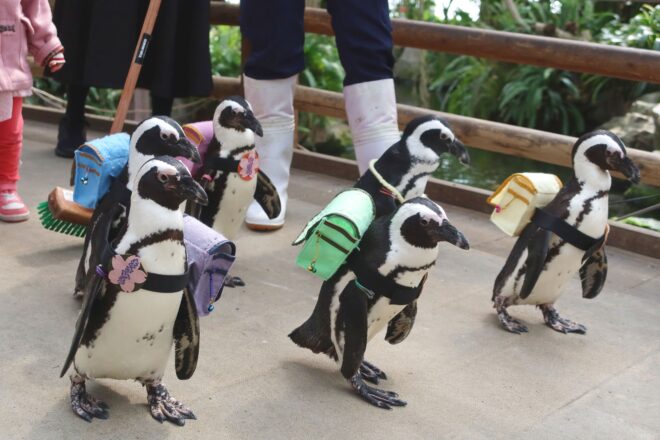 入学シーズンに合わせて、ペンギンたちが期間限定衣装のランドセルを身に着けてお散歩します。 ペンギンそれぞれのテーマカラーに合わせたカラフルなランドセルで登場します。